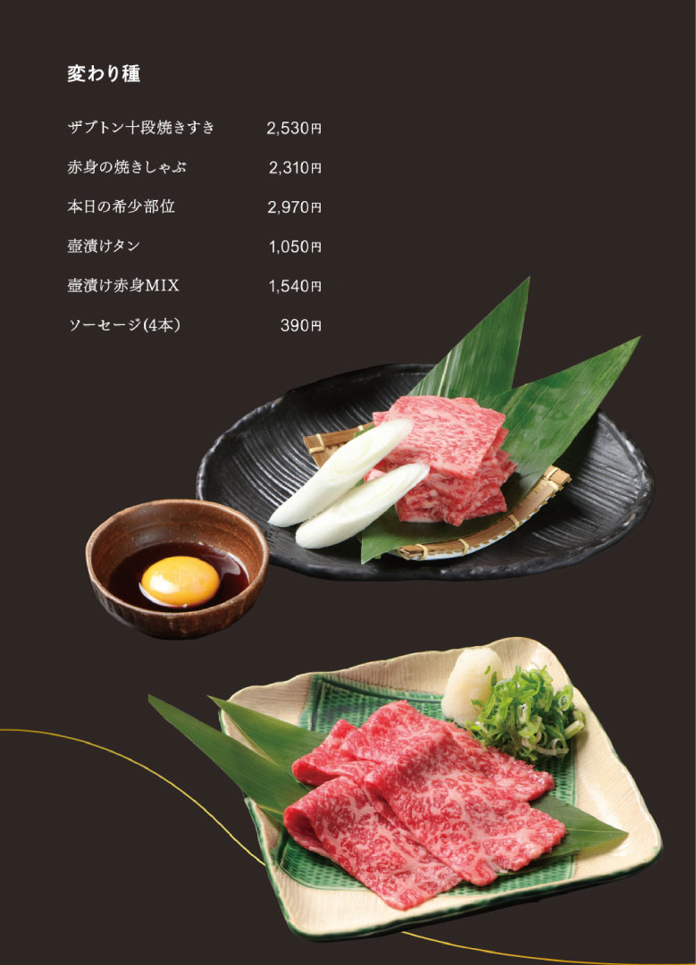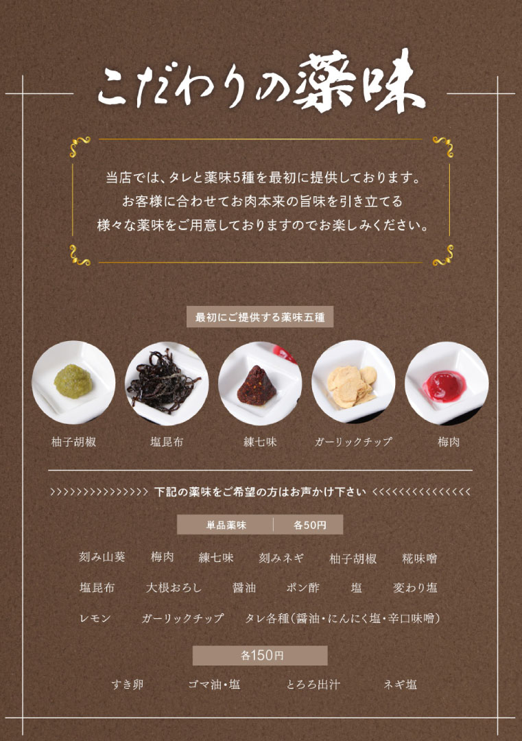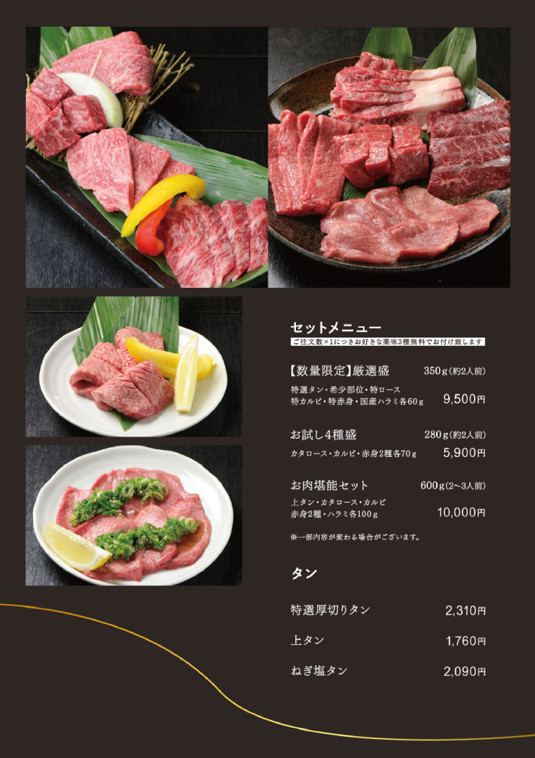 国産黒毛和牛から選び抜かれた霜降り肉を使い、 ロースにカルビ…各種ホルモンをご用意しております。 落ち着いた雰囲気の店内で、選び抜かれた上質なお肉を、ぜひご堪能ください。